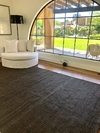Alfombra tejida en telar en hilo grueso de yute teñido negro.