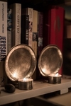 Portavelas de alpaca con plato reflector, hecho a mano por orfebres del norte argentino en técnica martelé.