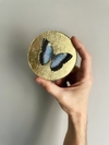 Set de 6 posavasos hechos a mano en decoupage con dorado a la hoja, en seis especies de mariposas. Redondos de 9cm de diámetro en vidrio de 0,2mm de espesor, con bordes pulidos. Papel autoadhesivo aterciopelado negro del lado del reverso. El set viene en caja rígida de papel kraft.